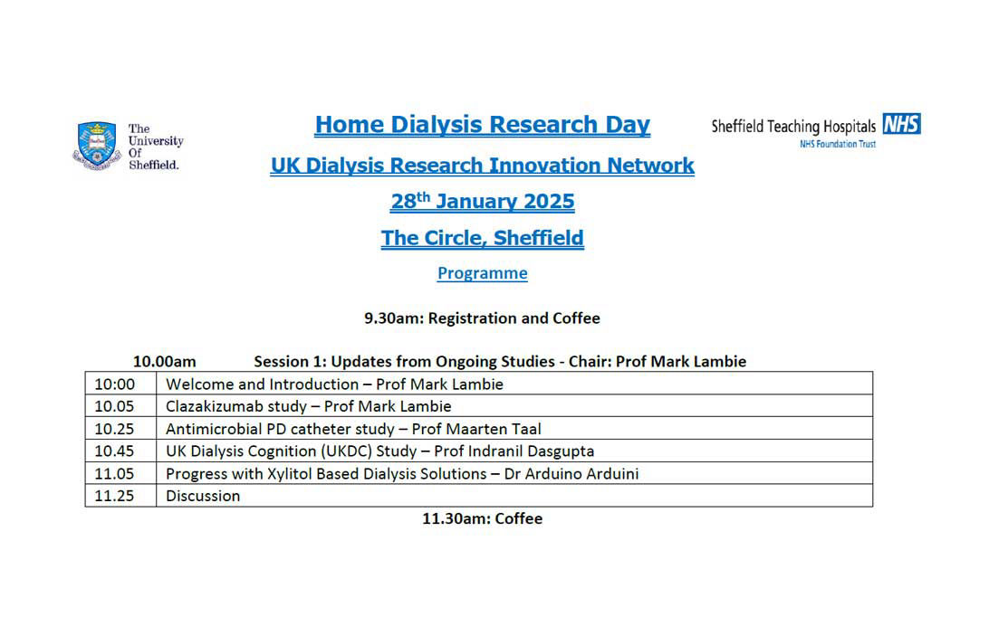 Dr Arduino Arduini invited by the University of Sheffield and the UK Kidney Foundation to participate as a speaker at the Home Dialysis Research Day for an update on the ELIXIR clinical trial